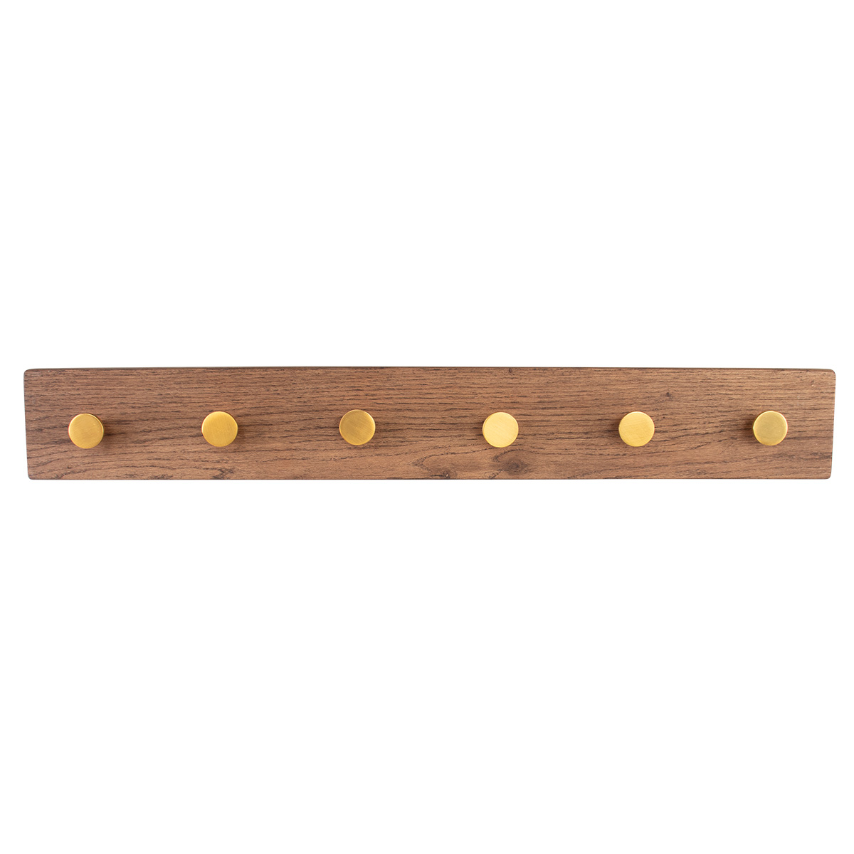 Denne elegante knagerække med 6 guldknapper forener funktionalitet og eksklusivt design i ét tidløst møbel. Knagerækken er fremstillet i massivt træ og udstyret med seks runde knapper i guldfinish, som tilfører et varmt og sofistikeret udtryk.