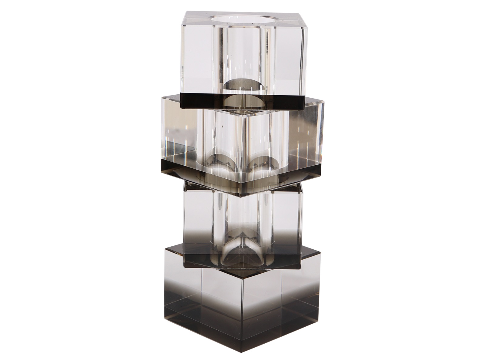 Flora er en elegant og dekorativ glasvase, der skiller sig ud med sit markante design og kontrast mellem sort og klart glas. Den geometriske form og tunge kvalitet giver vasen et eksklusivt udtryk, som passer perfekt ind i moderne boligindretning.