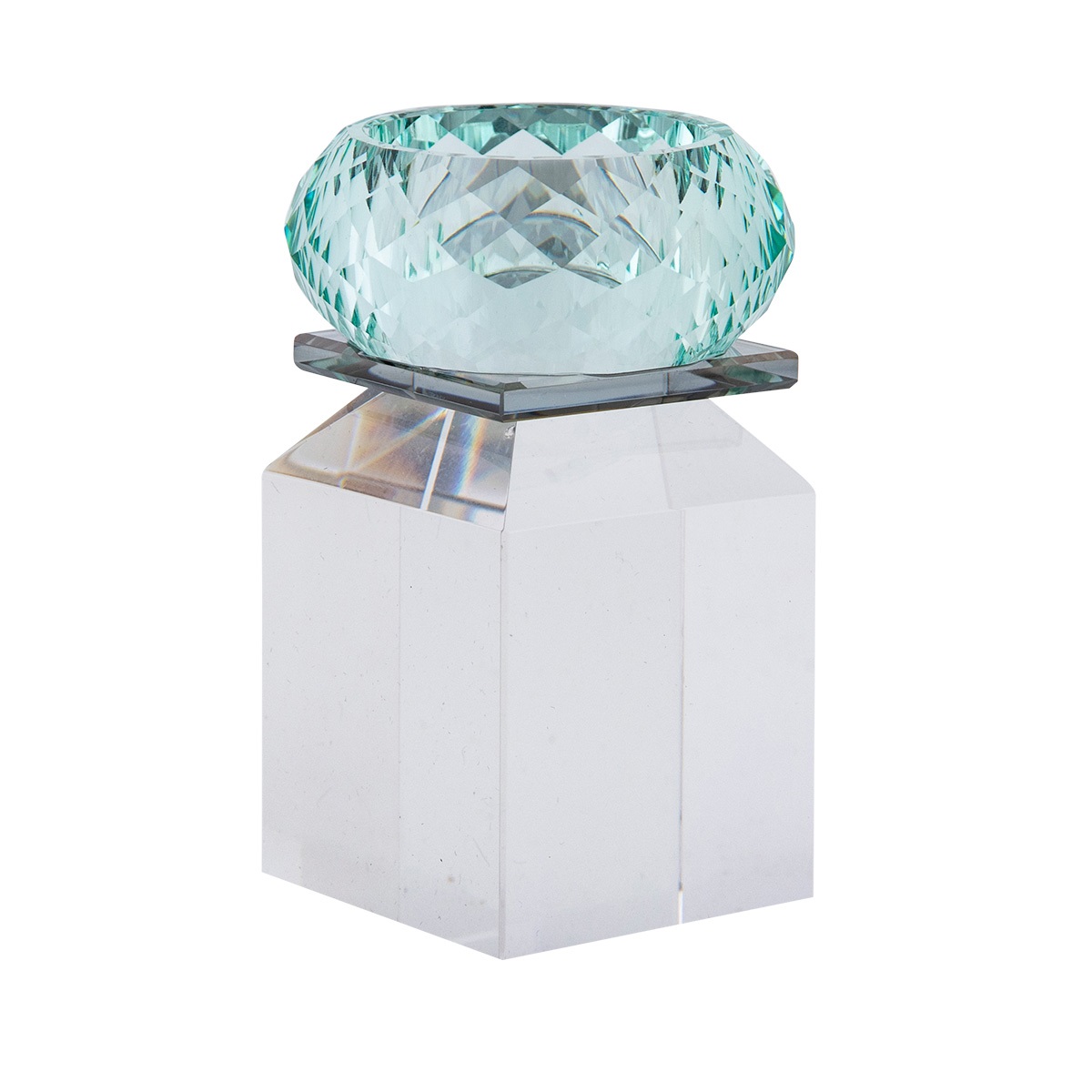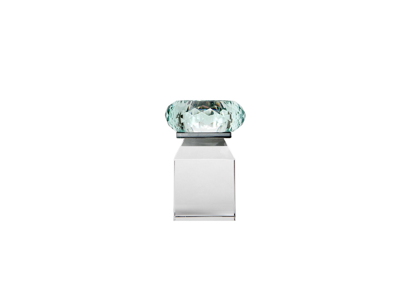 Honeysuckle lysestagen er håndlavet i massivt, gennemfarvet glas i nuancerne klar, smoke og mintgrøn. Den facetslebne top reflekterer lyset smukt og skaber en levende krystaleffekt, der tilfører rummet en rolig og eksklusiv stemning.