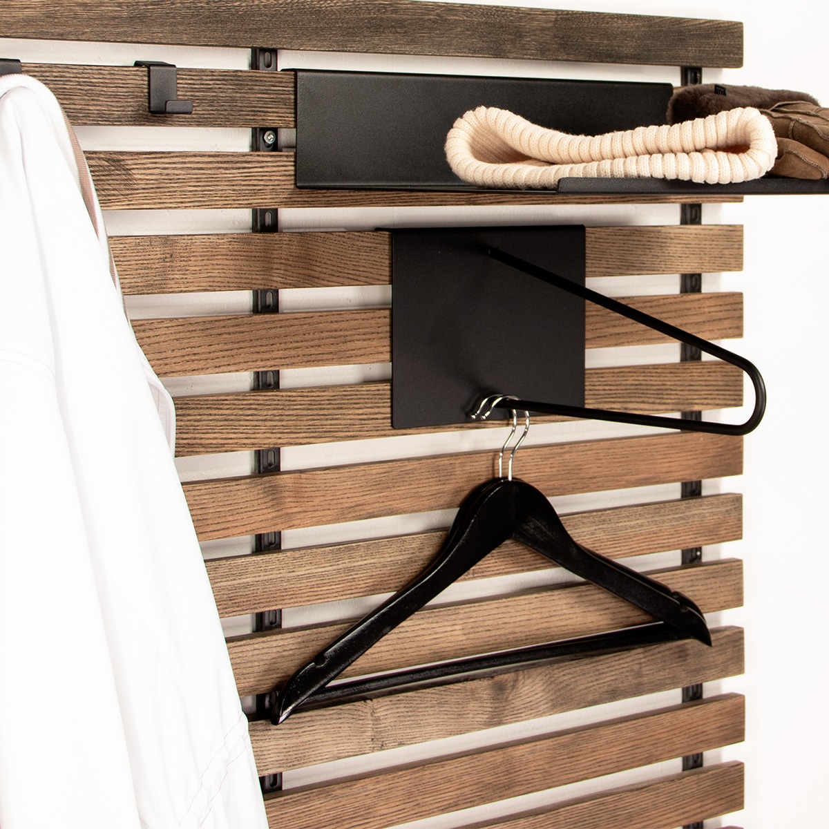 Hæng jakker, frakker eller skjorter op på bøjle – og hold dit tøj organiseret og pænt. Bøjlehængeren er fremstillet i sortlakeret metal og monteres nemt på vægpanelernes lameller uden brug af værktøj.