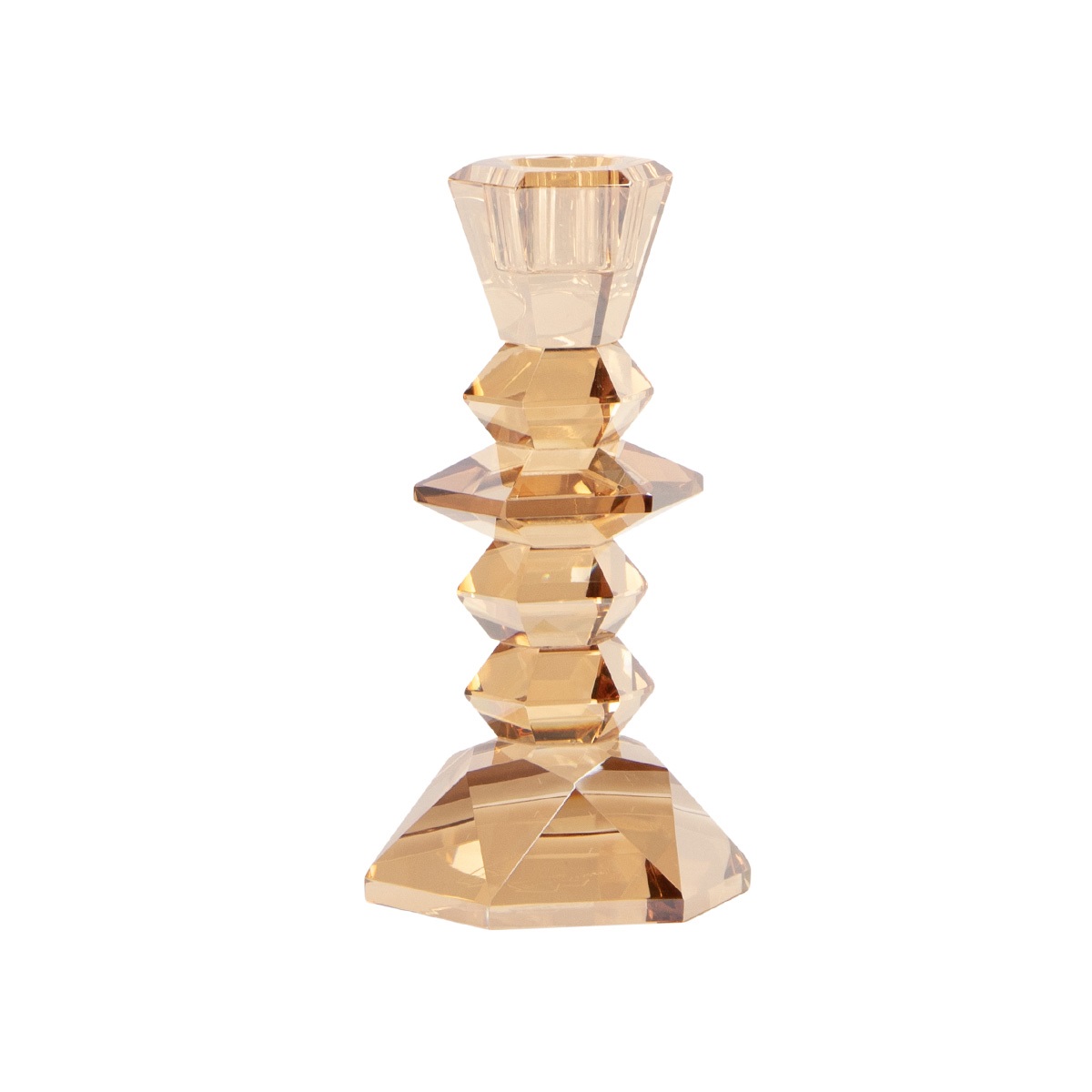 Viola-lysestagen er en dekorativ og stilfuld tilføjelse til hjemmet. Den er håndlavet i massivt glas og kommer i en smuk champagnefarve, der tilfører varme og eksklusivitet til enhver indretning. De mange slebne detaljer i glasset reflekterer lyset og skaber en fortryllende krystaleffekt.