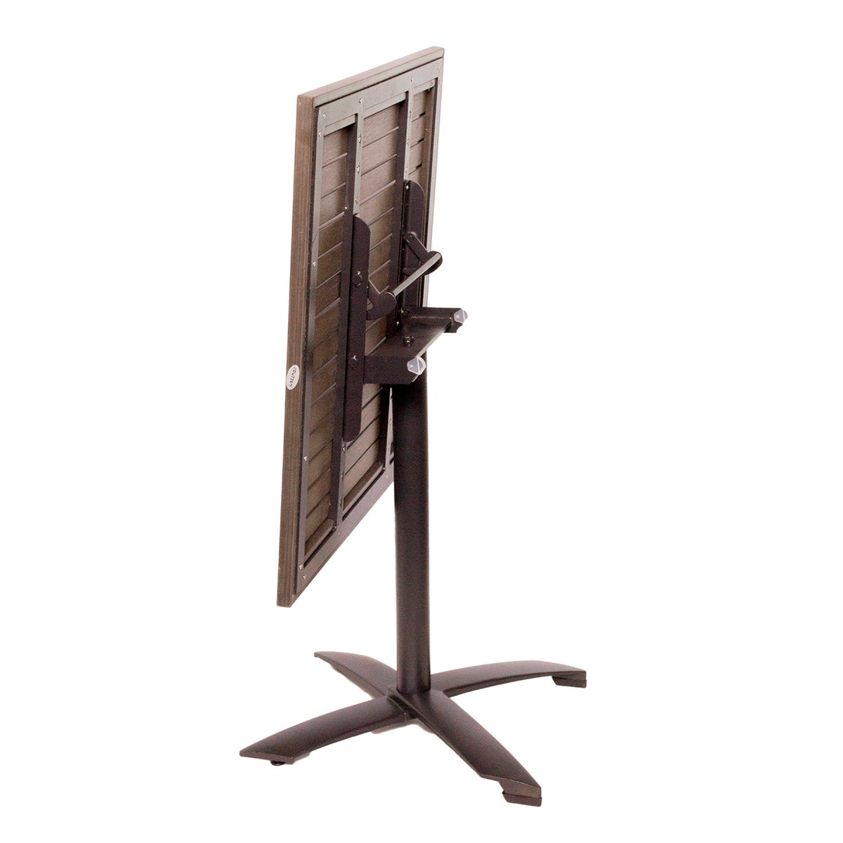 Sunna står på et stabilt sort metalstel med central søjle og krydsfod, som sikrer god stabilitet og samtidig giver god benplads omkring bordet. Bordpladen kan desuden vippes, så bordet er nemt at flytte eller opbevare, når det ikke er i brug.