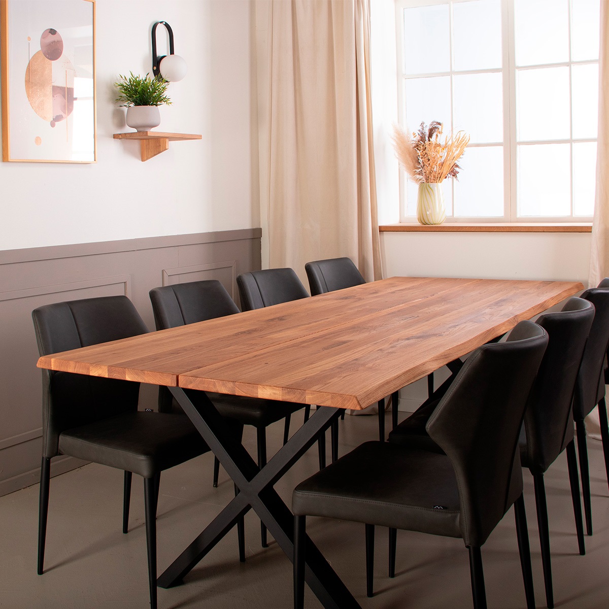 Curve plankebordsplade fra House of Sander er udarbejdet i massiv FSC certificeret egetræ. Den massive bordplade er perfekt egnet som spisebord. Plankebordet er todelt og er med natur bølget kanter. Alle vores stel kan monteres på alle plankeborde.